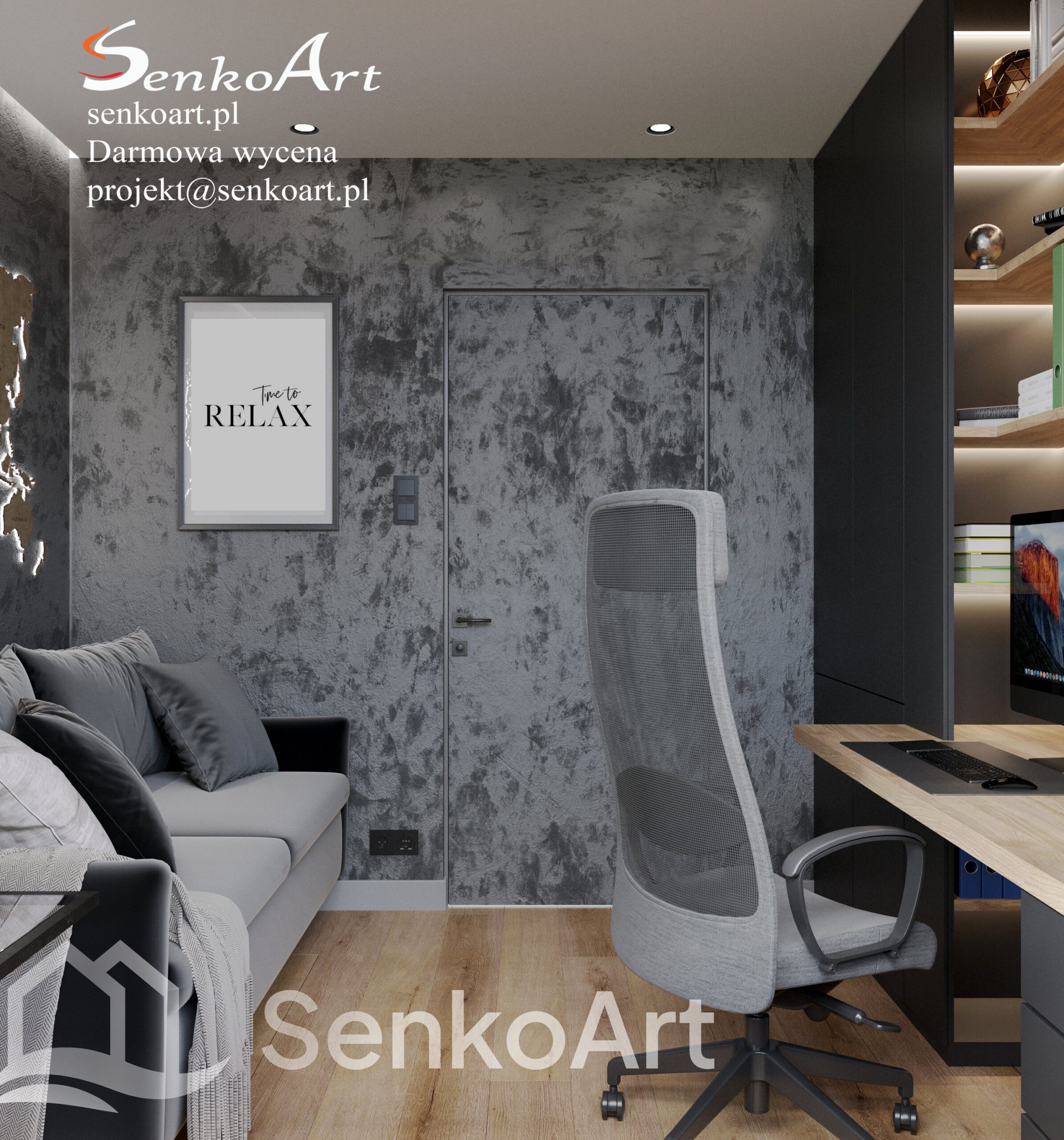 Pomieszczenie zostało zaplanowane w taki sposób, aby optymalnie wykorzystać każdy metr kwadratowy. Wyodrębniono strefę pracy z dużym biurkiem, część do przechowywania dokumentów oraz strefę relaksu. Odpowiednie zaaranżowanie przestrzeni zapewnia ergonomię i komfort codziennego użytkowania.