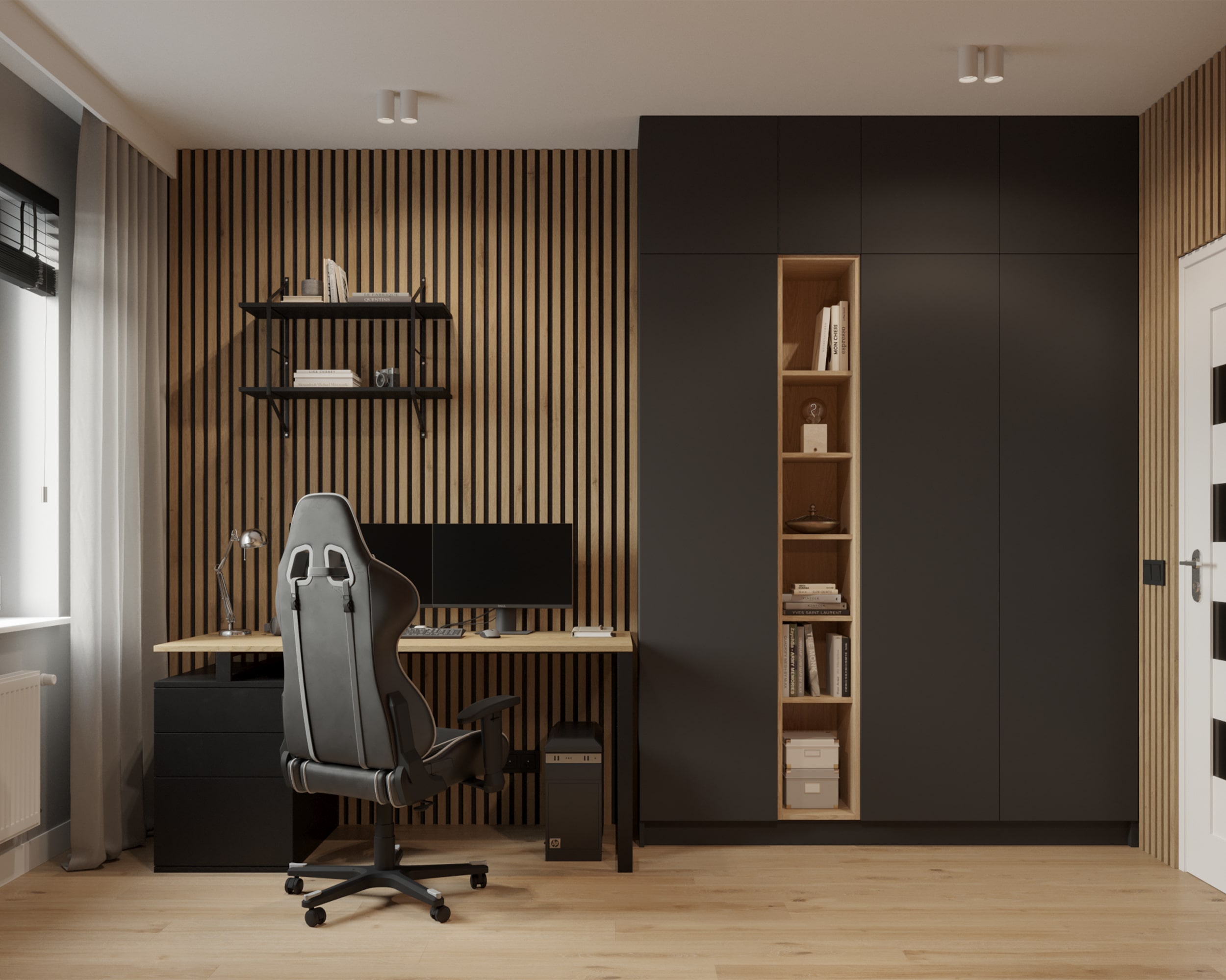 Całość aranżacji podporządkowana została zasadom ergonomii. Biurko z czarną podstawą i blatem w naturalnym drewnie jest proste w formie, ale zapewnia komfort pracy i wpisuje się w nowoczesne standardy home office. Wysoka zabudowa na wymiar w kolorze głębokiego antracytu oferuje wiele miejsca do przechowywania, a otwarte wnęki przełamują jej masywność, eksponując drewno jako element ocieplający.