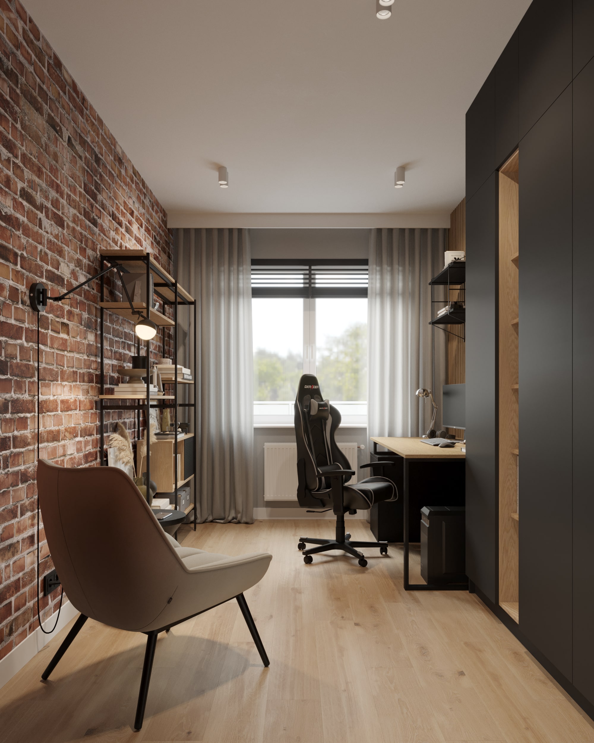 Dzięki tak dobranym materiałom – cegle, naturalnemu dębowi, czarnej stali i matowym wykończeniom – gabinet zyskuje wyrazisty, nowoczesny charakter w stylu industrialnym, a jednocześnie pozostaje ciepły, ergonomiczny i przyjazny do codziennej pracy.
